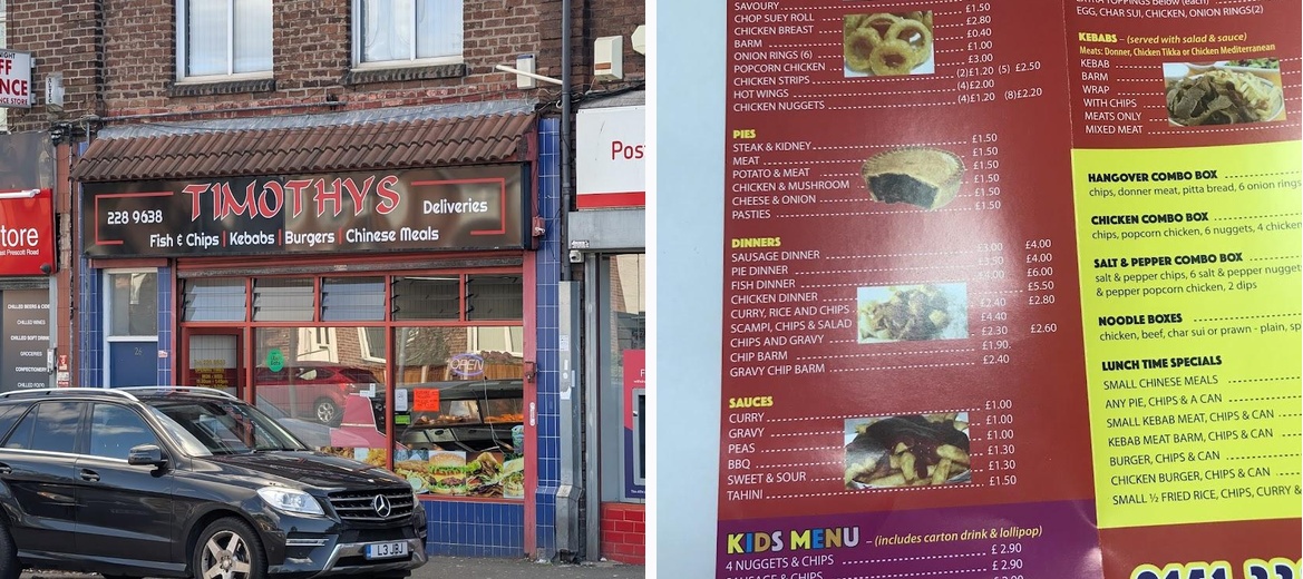 Welcome to Timothy's Fish & Chips, the go-to destination for authentic fish and chips in Stoneycroft, Liverpool. With a casual atmosphere and a focus on quality, our menu offers a delightful range of options, including classic fish, mouth-watering ribs, and satisfying burgers. Whether you're dining in, taking away, or enjoying late-night bites, we provide wheelchair-accessible seating and a kids' menu to ensure a great experience for everyone. Known for our friendly staff and reasonable prices, Timothy's is perfect for a quick lunch or a family meal. Join us for delicious food that satisfies cravings at any time of day!Customers love the perfectly cooked fish that is always fresh and flaky, paired with fluffy chips that hit the spot. The variety on the menu keeps everyone happy, from kids savoring nuggets to adults enjoying a hearty steak and kidney pie.